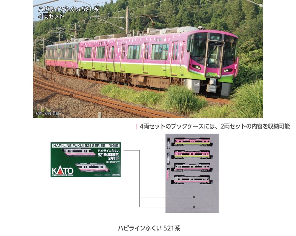 â—†The 521 series of Hapi Line Fukui, which was born with the extension of the Hokuriku Shinkansen to Tsuruga, is now available. In addition to the two-car set with the regular paint color, a four-car set will also be released that combines the fully wrapped train, which only exists in two trains, with the regular paint color. You can enjoy it together with the 10-1959/1960 683 series 0-type "Thunderbird" (renovated car) and the 10-2071 683 series "Shirasagi" (new paintwork) that you will see at Tsuruga Station.