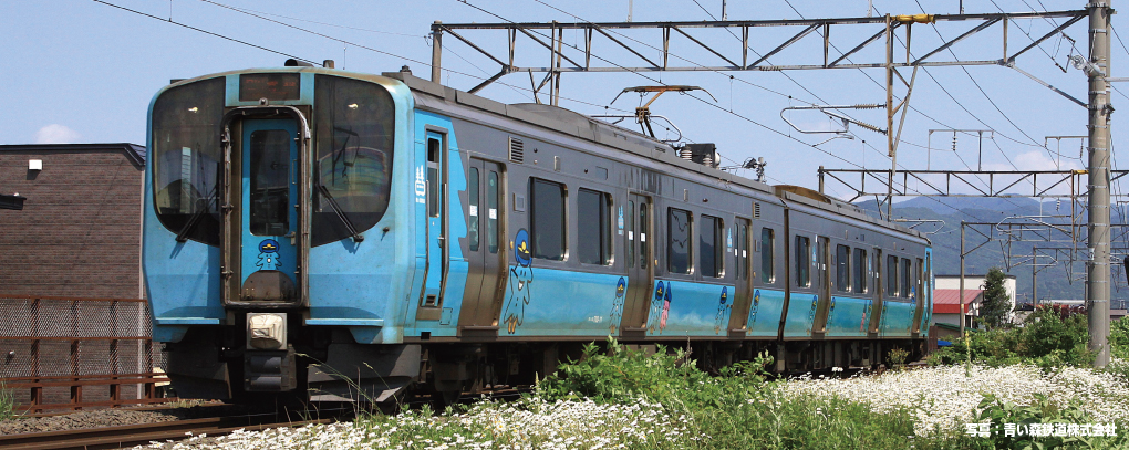 This figure features the Aoimori 703 Series, which operates on the Aoimori Railway line parallel to the Tohoku Shinkansen. The Aoimori 703 Series is the successor to the company's Aoimori 701 Series, designed and manufactured based on JR East's E721 Series. Like the E721 Series, it features a low-floor, barrier-free body structure utilizing small-diameter wheels and an interior layout based on box seats. The body design is based on Aoimori Railway's corporate color, light blue, and features the company's mascot, Molly, next to the passenger doors. Unlike the Aoimori 701 Series, it also features a pink Molly.